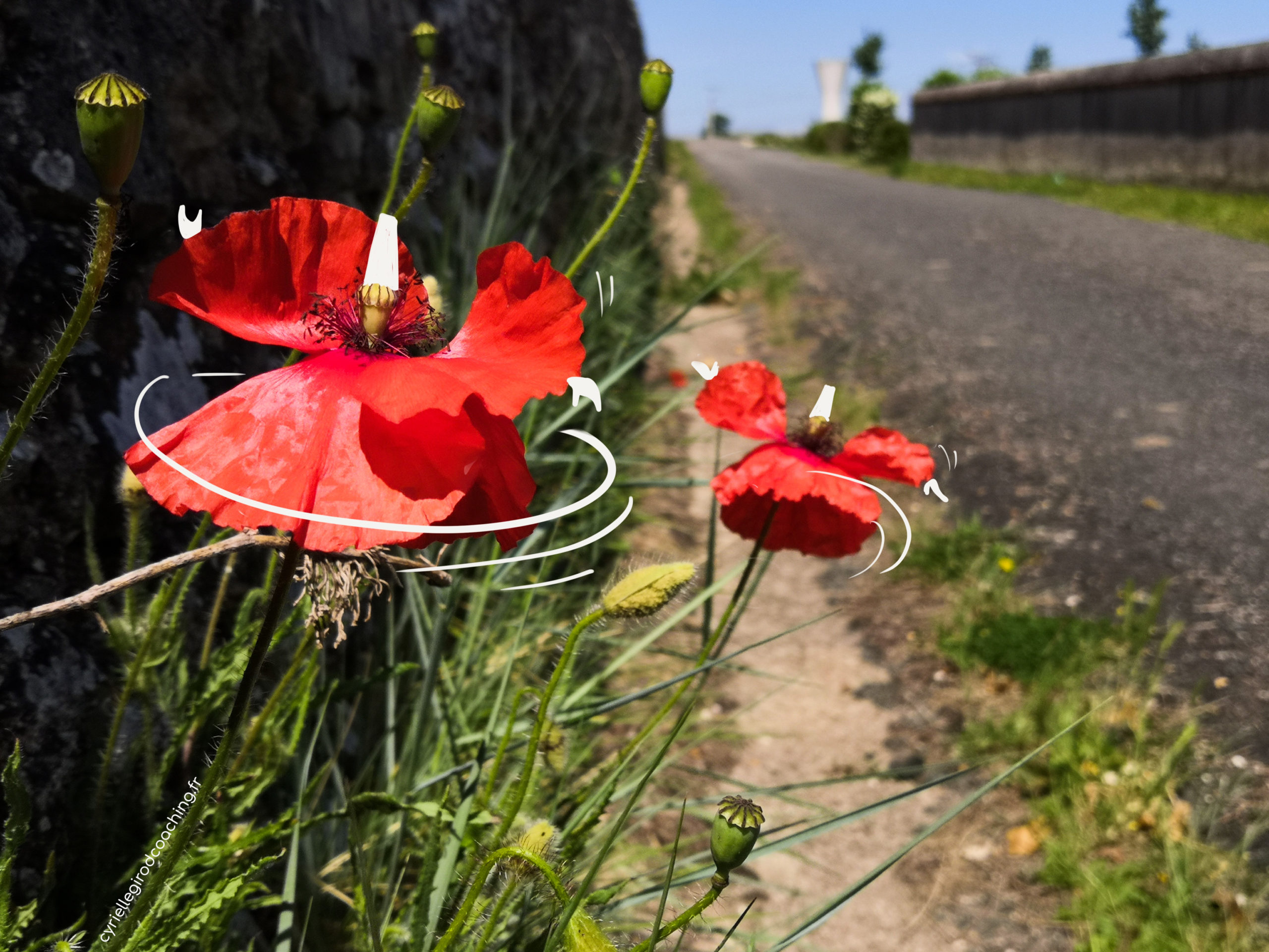 Vouvray – 29 mai – Nature légère et cynique offre un spectacle vivant, rue du cimetière…Ici et là, deux coquelicots, sous le vent, font voyager les passants en pays ottoman. Merci derviches tourneurs de l’instant, danseurs en transe tournoyants, d’amener ici vie et mouvements. Une main tendue vers le ciel, l’autre vers le sol; passent ainsi grâce et magie dans cette rue endormie.